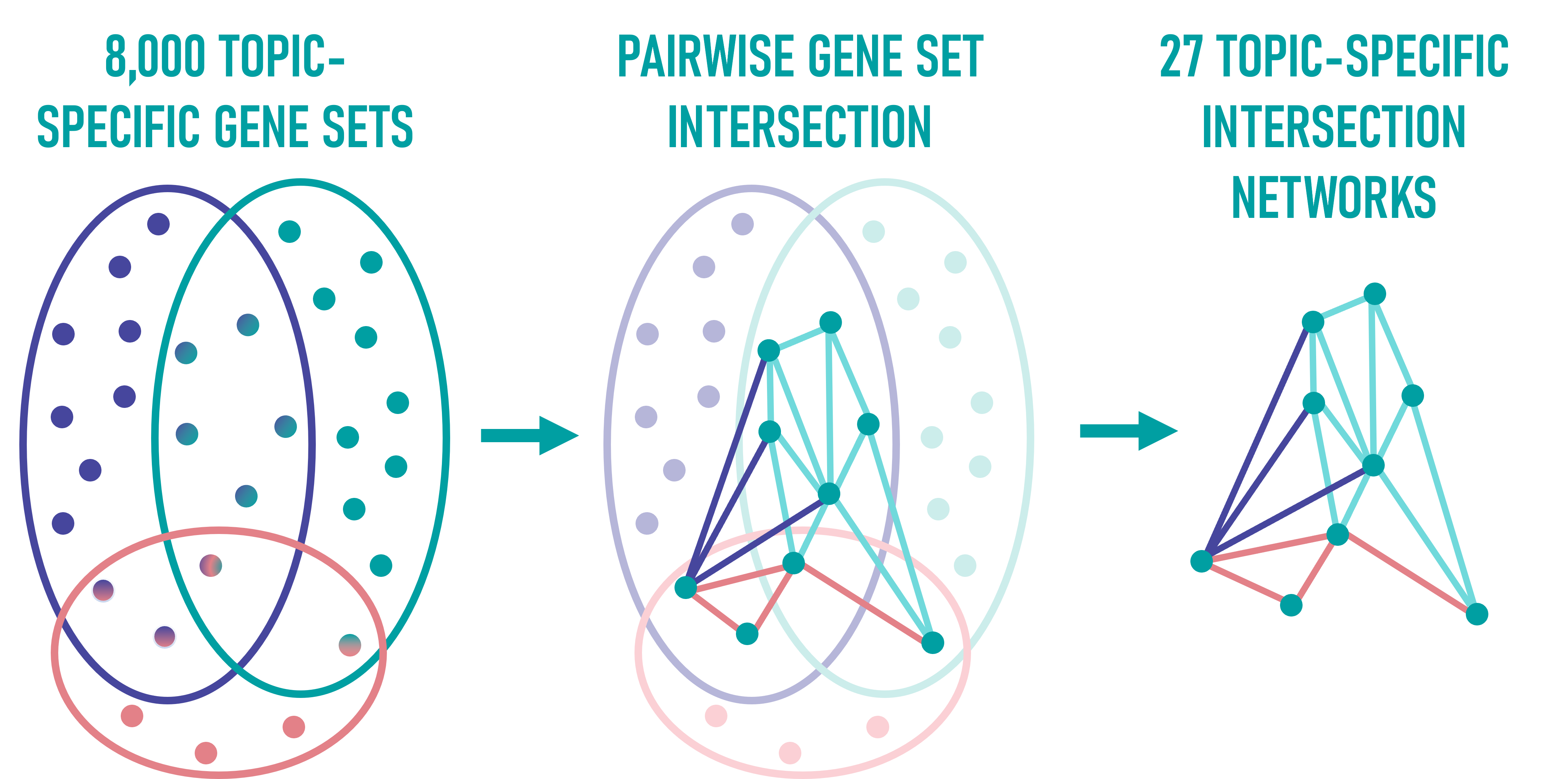 A gene is included in the network if it appears in at least two gene sets associated with the same topic cluster.