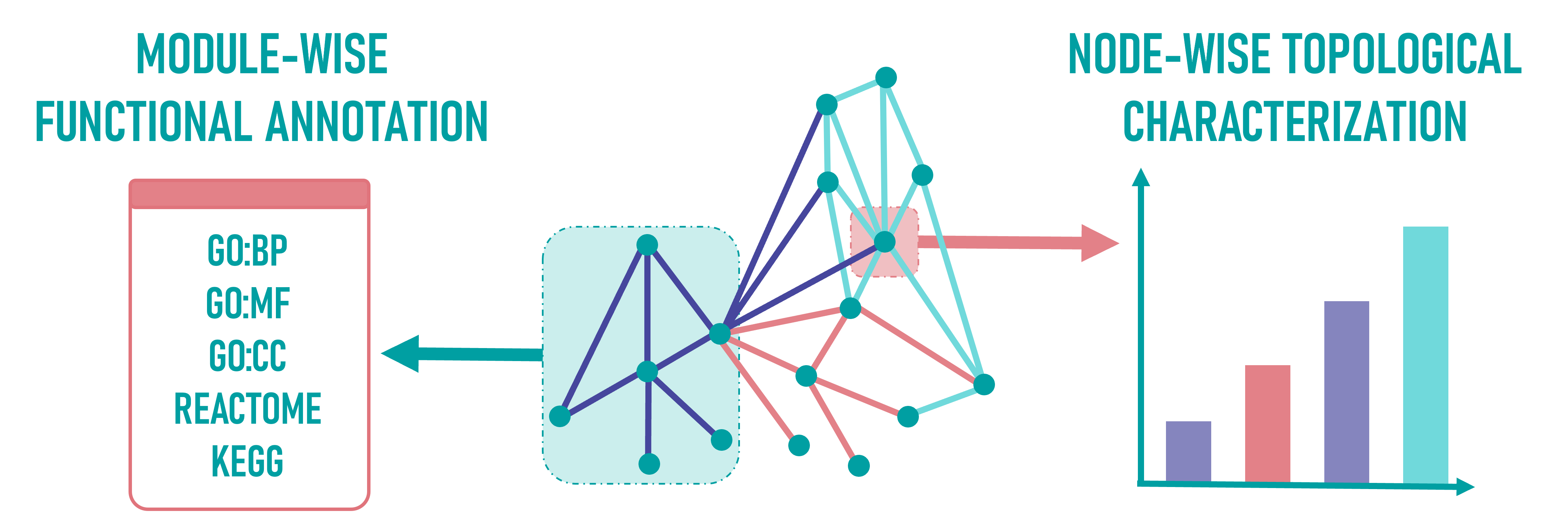 Enrichment terms (e.g., GO Biological Processes) are identified via over-representation analysis using g:Profiler (Kolberg et al.,
